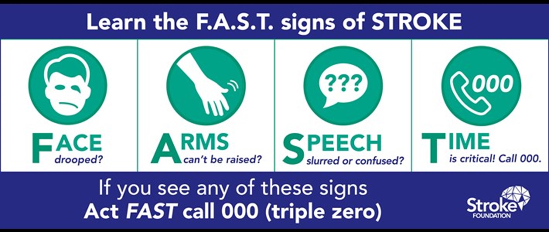 The Australian Stroke Foundation has created the FAST test as an easy way to recognise and remember the signs of a stroke [4].